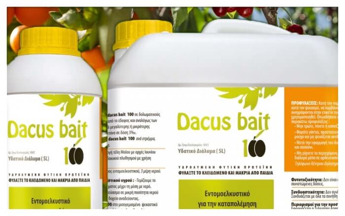 Το Dacus Bait 100® είναι εντομοελκυστικό για την αντιμετώπιση του δάκου της ελιάς (Bactrocera Oleae), της μύγας της Μεσογείου (Ceratitis Capitata) που συνήθως συναντάται στα εσπεριδοειδή και της ραγολέτιδας της κερασιάς (Rhagoletis Cerasi) (Αριθμός Αδείας: 9075). [...]